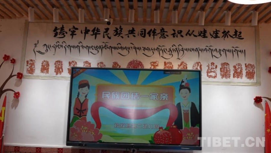 幼兒園主教學(xué)樓內(nèi)懸掛著一幅書法作品,上面寫道:“鑄牢中華民族共同體意識從娃娃抓起?!闭驗樯钤诿褡褰煌涣鹘蝗诘默F(xiàn)實環(huán)境中,了解各民族和睦相親的真實故事,這里的孩子們才能在第一時間毫不猶豫地回答五十六個民族是一家,才能從心底認(rèn)同中華民族是我們共同的名字。中華民族共同體意識正在一代又一代娃娃的心中萌發(fā)新芽、深深扎根。中國西藏網(wǎng) 實習(xí)記者/宋俊