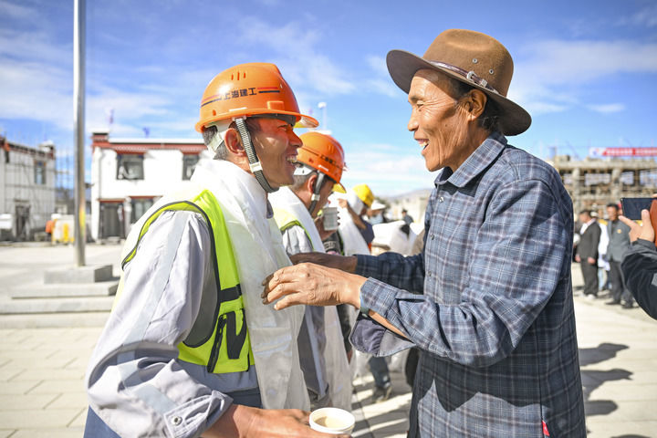 機(jī)器的轟鳴聲與悠揚(yáng)的藏民族歌曲交織在一起,村民們依次向援建者獻(xiàn)上潔白的哈達(dá)、斟滿飄香的酥油茶,還有村民用大拇指蘸著白色的糌粑在他們身上點(diǎn)個指印,宛如一個個真誠的“點(diǎn)贊”,場景溫暖感人。