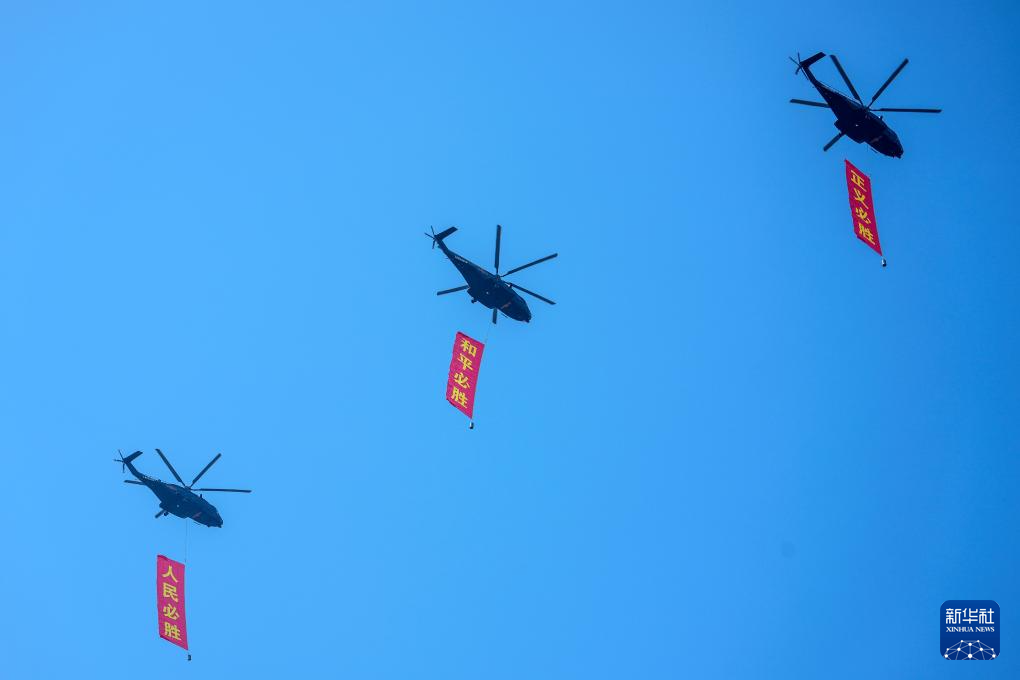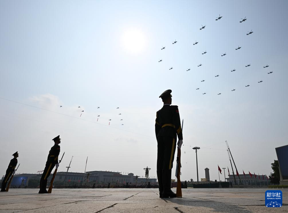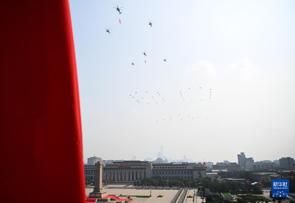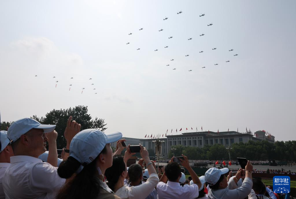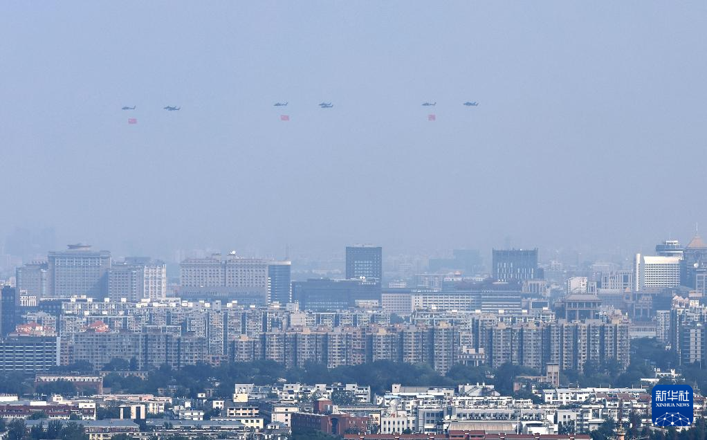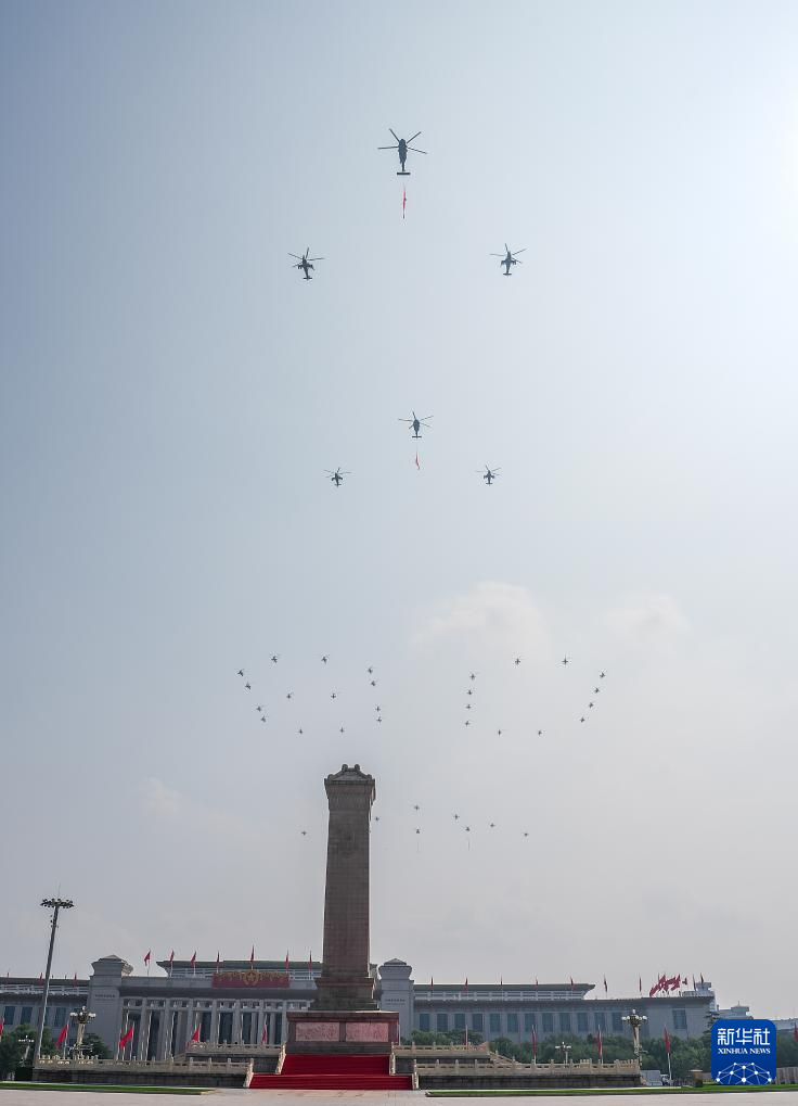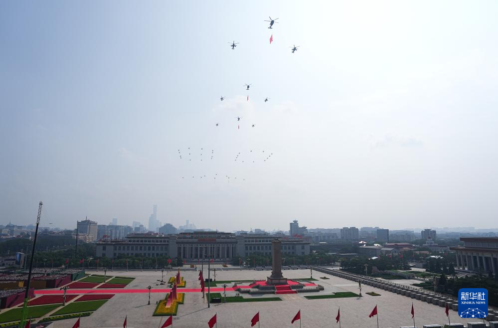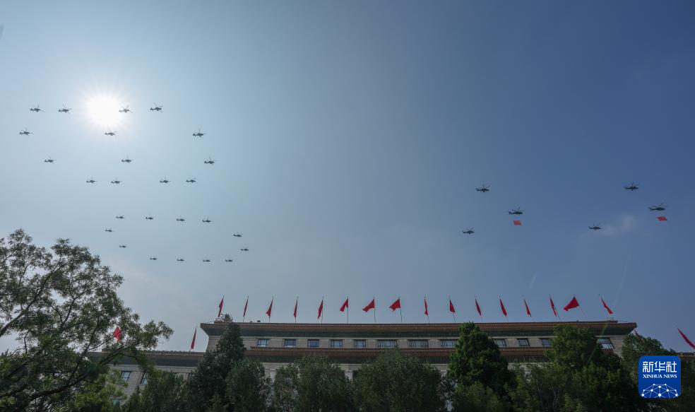 9月3日,紀(jì)念中國人民抗日戰(zhàn)爭暨世界反法西斯戰(zhàn)爭勝利80周年大會在北京隆重舉行。這是空中護(hù)旗梯隊飛過天安門廣場上空,26架直升機匯成巨大的“80”字樣。