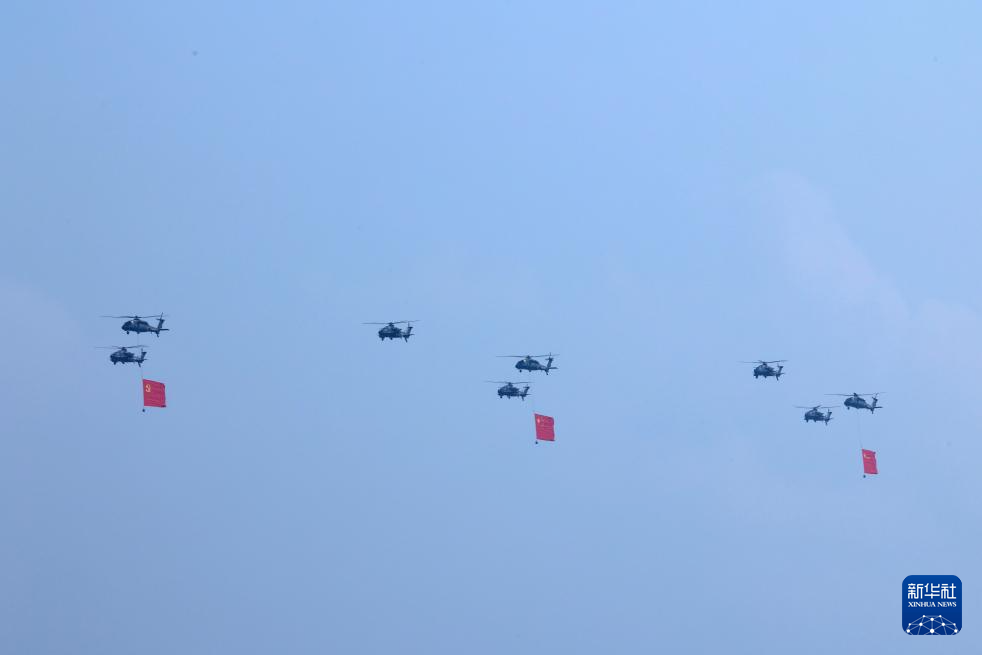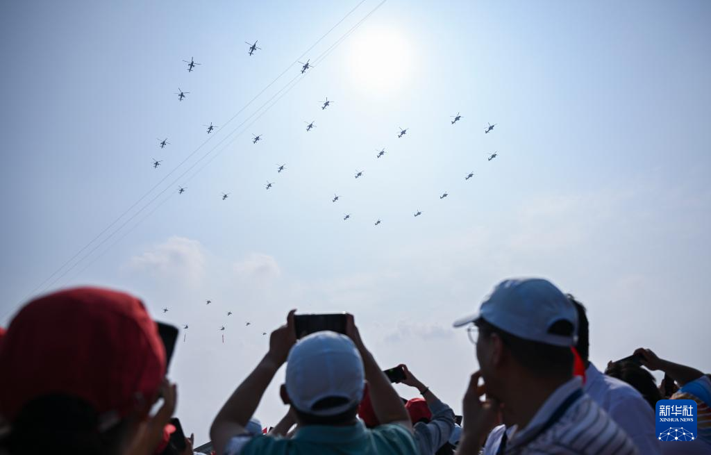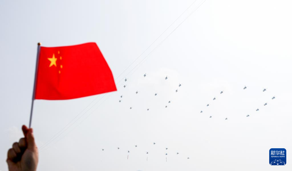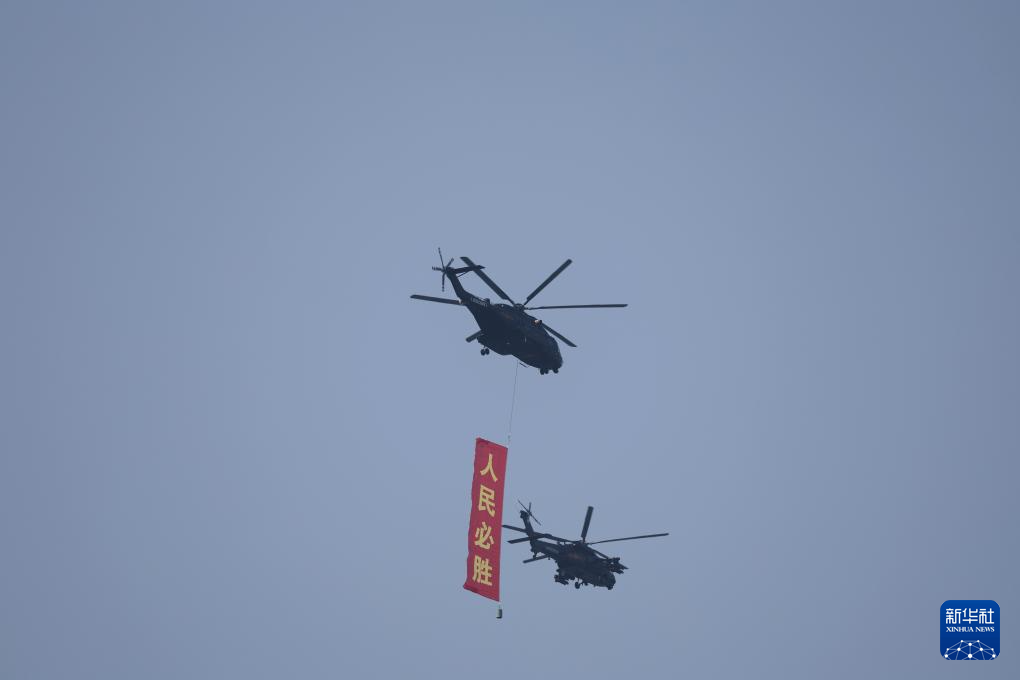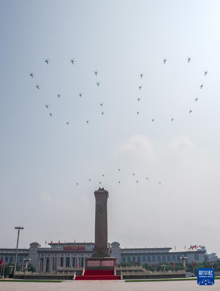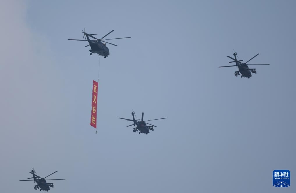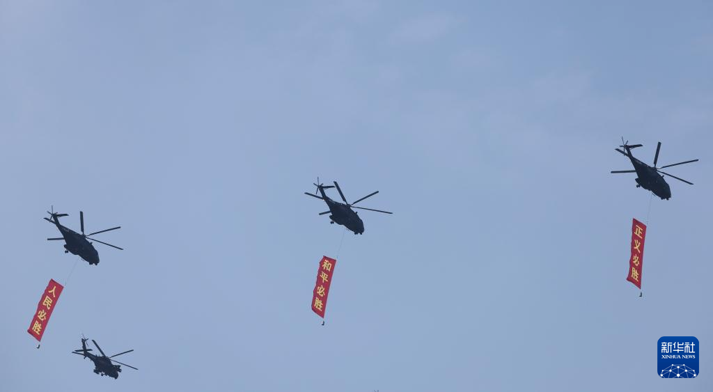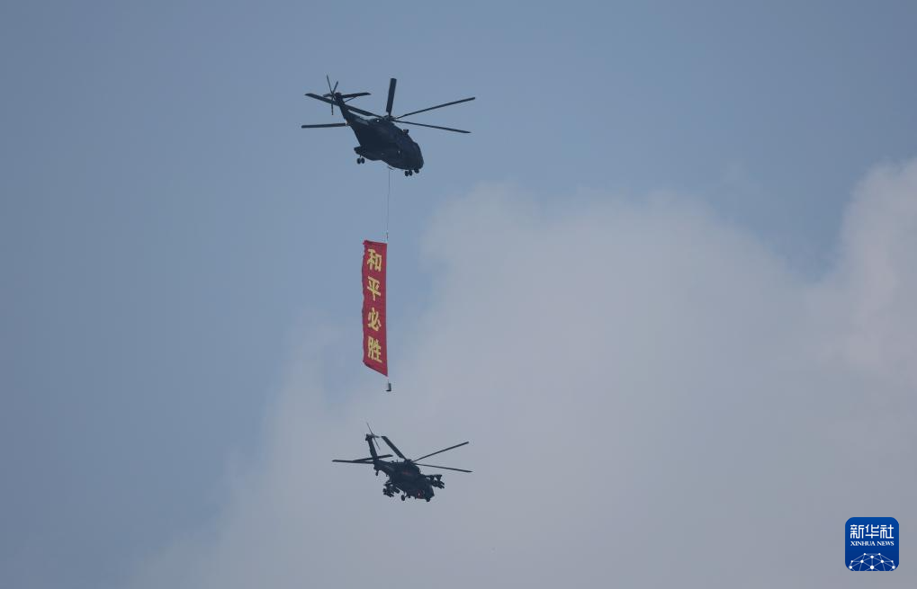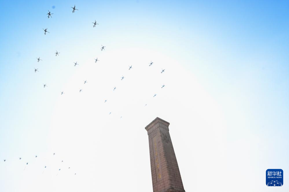 9月3日,紀(jì)念中國人民抗日戰(zhàn)爭暨世界反法西斯戰(zhàn)爭勝利80周年大會在北京隆重舉行。這是空中護(hù)旗梯隊飛過天安門廣場上空,26架直升機匯成巨大的“80”字樣。