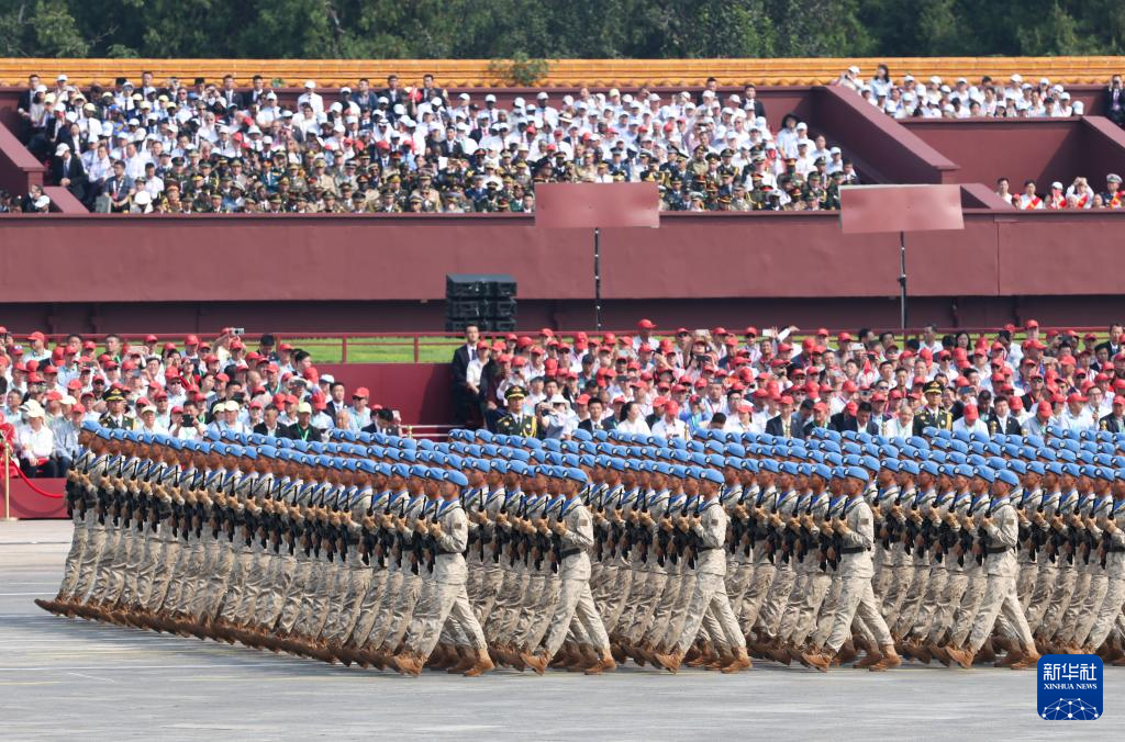 9月3日,紀(jì)念中國人民抗日戰(zhàn)爭暨世界反法西斯戰(zhàn)爭勝利80周年大會在北京隆重舉行。這是維和部隊方隊接受檢閱。