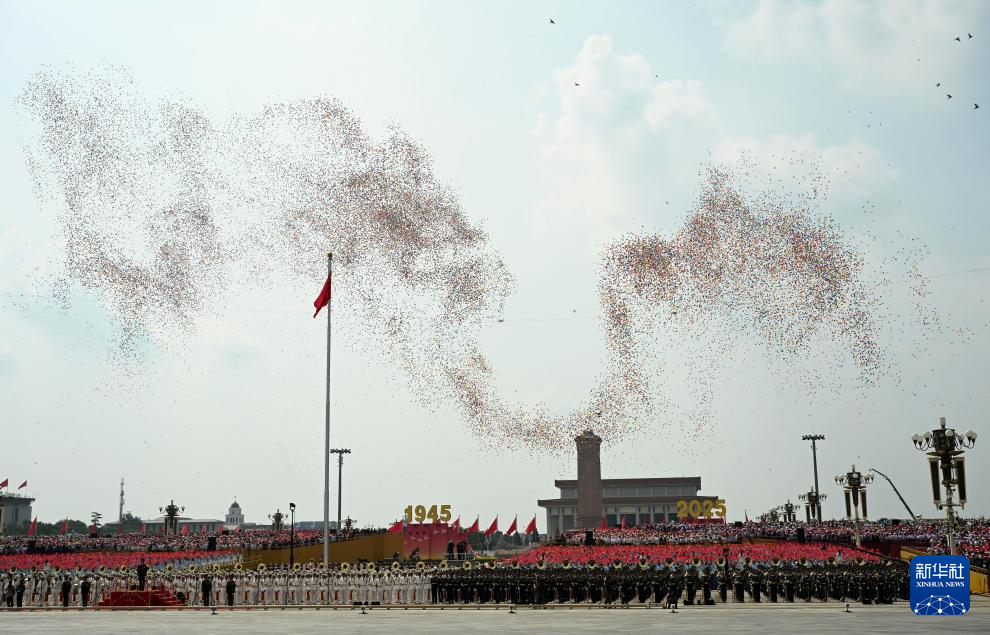 9月3日,紀念中國人民抗日戰(zhàn)爭暨世界反法西斯戰(zhàn)爭勝利80周年大會在北京隆重舉行。這是紀念大會現(xiàn)場放飛氣球。