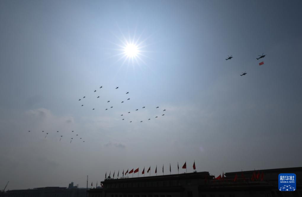 9月3日,紀(jì)念中國人民抗日戰(zhàn)爭暨世界反法西斯戰(zhàn)爭勝利80周年大會(huì)在北京隆重舉行。這是空中護(hù)旗梯隊(duì)飛過天安門廣場上空。