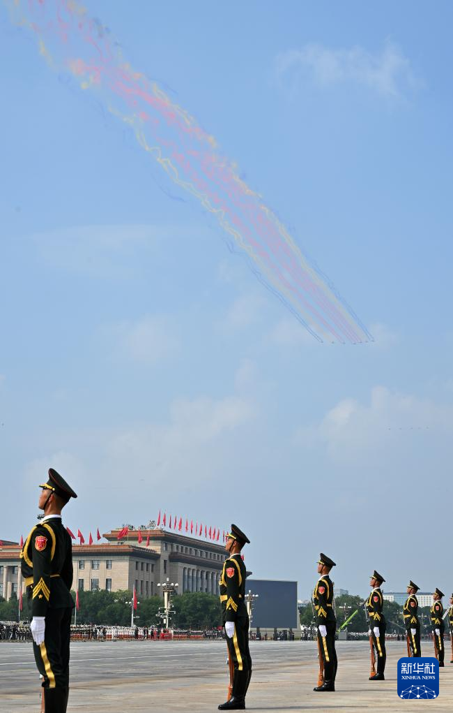 9月3日,紀(jì)念中國人民抗日戰(zhàn)爭暨世界反法西斯戰(zhàn)爭勝利80周年大會(huì)在北京隆重舉行。這是空中護(hù)旗梯隊(duì)通過天安門廣場。