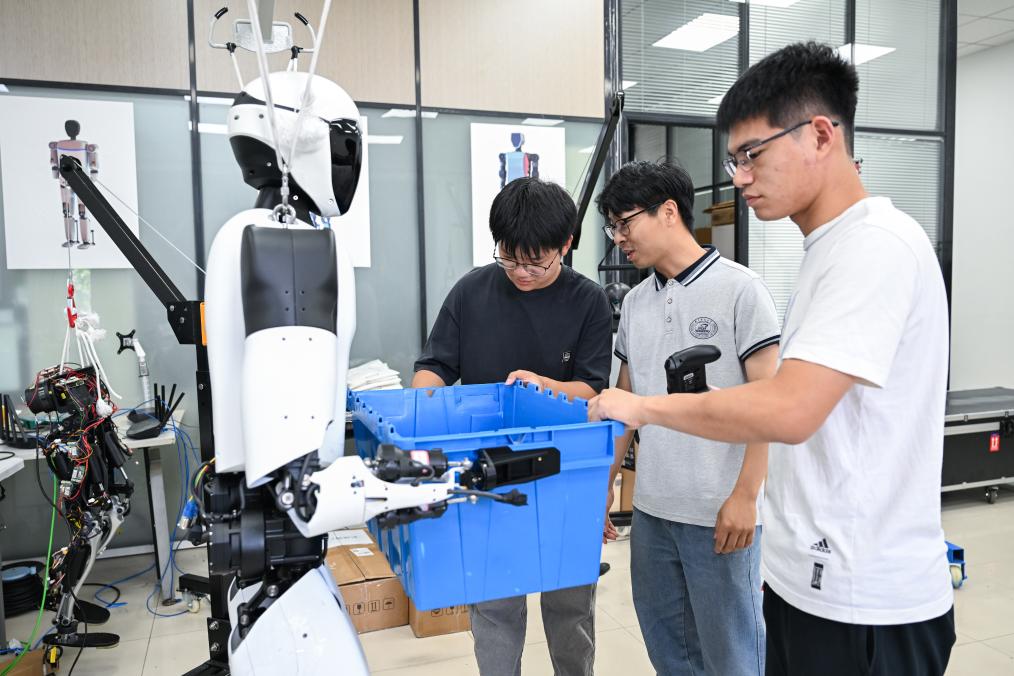 2025年5月29日,華中科技大學(xué)機(jī)械科學(xué)與工程學(xué)院,學(xué)生對“荊楚”人形機(jī)器人進(jìn)行搬運測試。新華社記者 杜子璇 攝