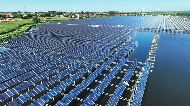2025年7月30日在遼寧省鐵嶺市鐵嶺縣大青水庫(kù)拍攝的光伏發(fā)電板(無人機(jī)照片)。新華社記者 楊青 攝