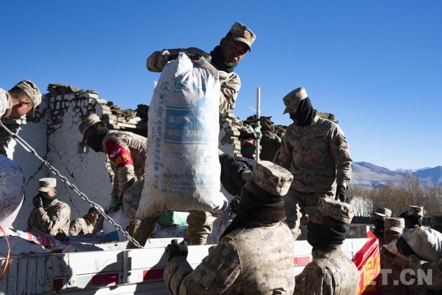 圖為在定日縣長所鄉(xiāng)嘎旦村解放軍官兵正在幫助受災(zāi)群眾搬運社會各界所捐贈的物資(攝于2025年1月8日) 攝影:趙振宇