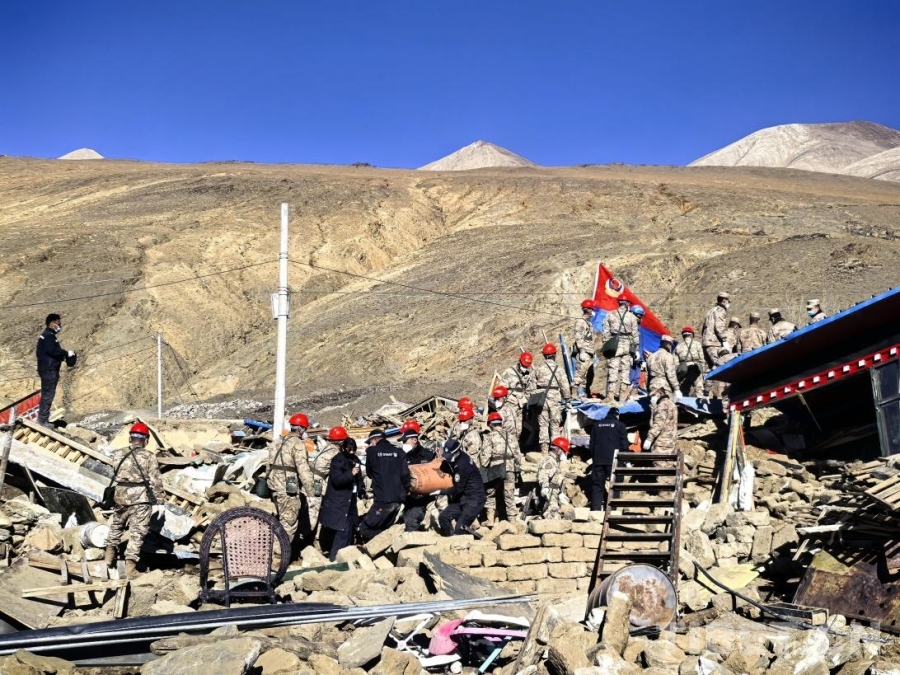 大地撕裂的瞬間,定日的山川記住了疼痛。這些影像定格了災(zāi)難降臨時的原始模樣——倒塌的房屋、揚起的塵土、撕裂的大地。但在滿目瘡痍中,更震撼的是那些逆行身影:人民子弟兵、消防救援隊伍、移民管理警察、公安干警與當(dāng)?shù)馗刹吭趶U墟上的緊急救援,一雙雙沾滿泥土的手在瓦礫中尋找生命的跡象。災(zāi)難過后,是無數(shù)人日夜兼程奔赴的開始。