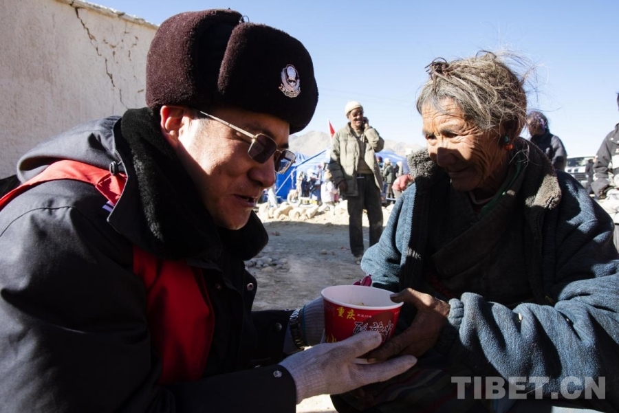 圖為在定日縣曲洛鄉(xiāng)措昂村受災(zāi)安置點,剛剛換崗的公安民警將自己手中的早飯送到受災(zāi)群眾的手中(攝于2025年1月9日) 攝影:趙振宇