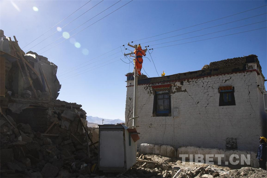 圖為地震發(fā)生第三日,在定日縣長所鄉(xiāng)森嘎村國家電網(wǎng)工作人員為受災(zāi)群眾安置點恢復(fù)電力供應(yīng)(攝于2025年1月9日) 攝影:趙振宇