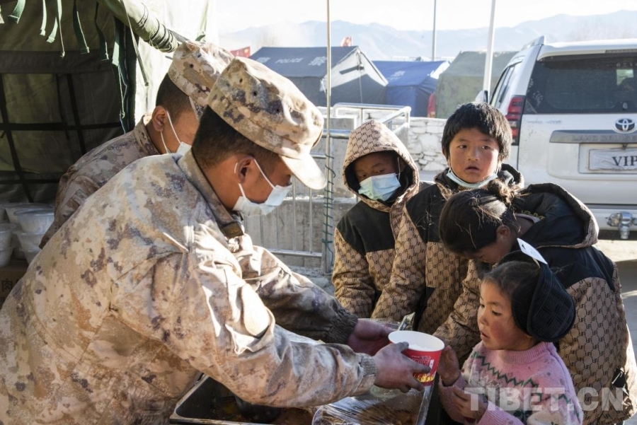 圖為在定日縣長所鄉(xiāng)古榮村安置點內(nèi),解放軍官兵為受災(zāi)群眾提供一日三餐(攝于2025年1月11日) 攝影:趙振宇