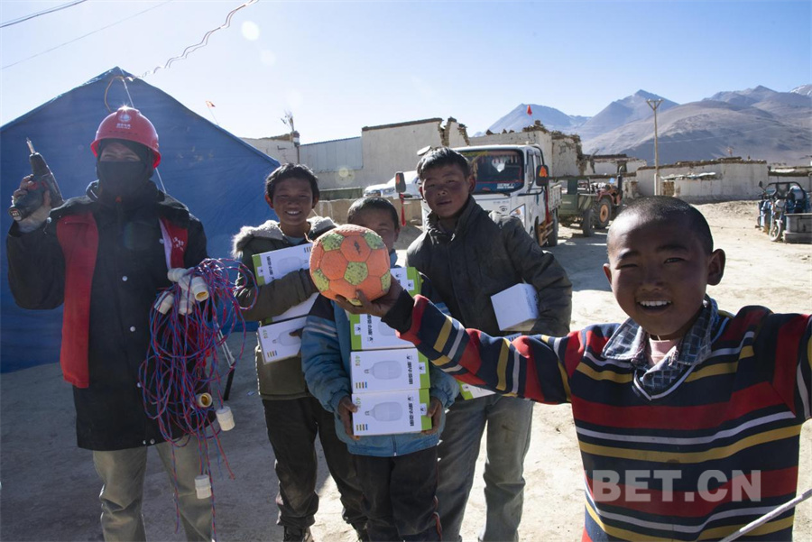 圖為地震發(fā)生第三日,在定日縣曲洛鄉(xiāng)措昂村國家電網(wǎng)工作人員為受災(zāi)群眾安置點通電,孩子們開心地加入工作人員的隊伍中隨時搭把手(攝于2025年1月9日) 攝影:趙振宇