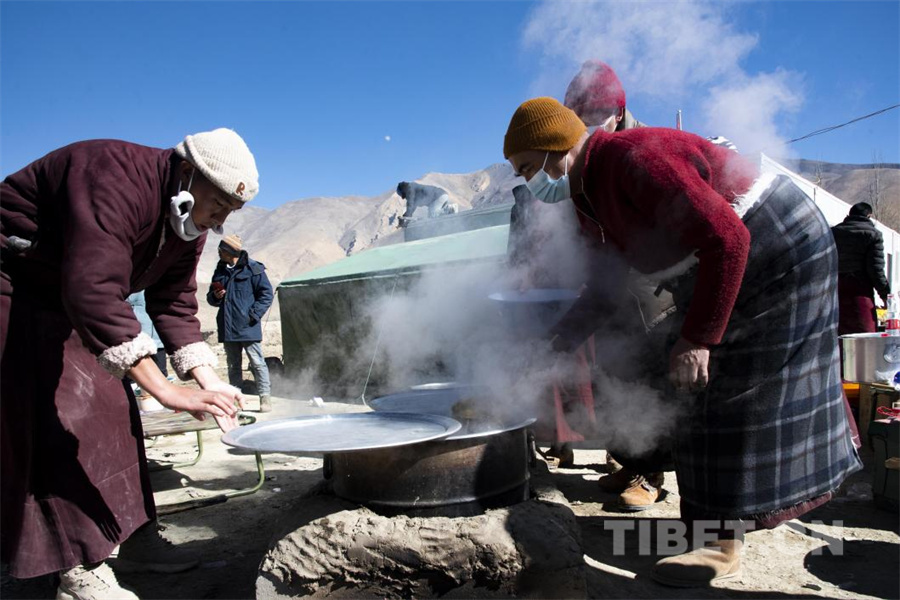圖為震后第一個藏歷新年古突夜,在定日縣長所鄉(xiāng)茶江村受災(zāi)群眾安置點里,村民扎西正在盛出熱氣騰騰的“古突”(攝于2025年2月27日) 攝影:趙振宇