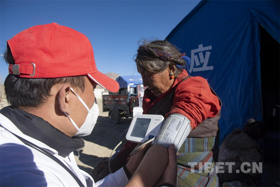 圖為在定日縣受災(zāi)群眾安置點,作為第一支挺進災(zāi)區(qū)的民間醫(yī)療力量,西藏阜康醫(yī)院的醫(yī)生正在為受災(zāi)群眾檢查身體(攝于2025年1月14日)攝影:趙振宇