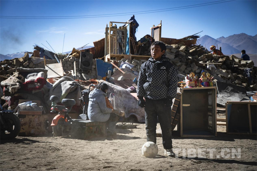 圖為在定日縣長所鄉(xiāng)古榮村,一名小男孩在自家廢墟前的空地上踢起足球,他們說足球能夠讓他們忘記失去家園的傷痛,能給自己帶來力量。(攝于2025年1月10日) 攝影:趙振宇
