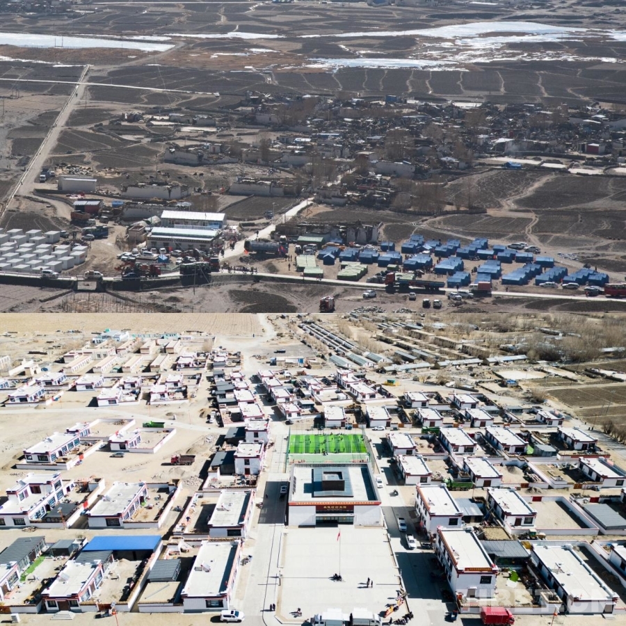 圖為西藏定日地震受災(zāi)最嚴(yán)重的村莊之一定日縣長(zhǎng)所鄉(xiāng)森嘎村。(拼版圖片,上圖攝于2025年1月11日,下圖攝于2026年1月5日)攝影:趙振宇