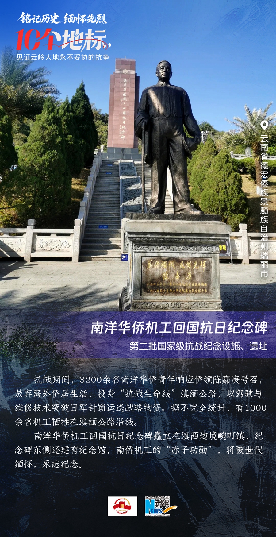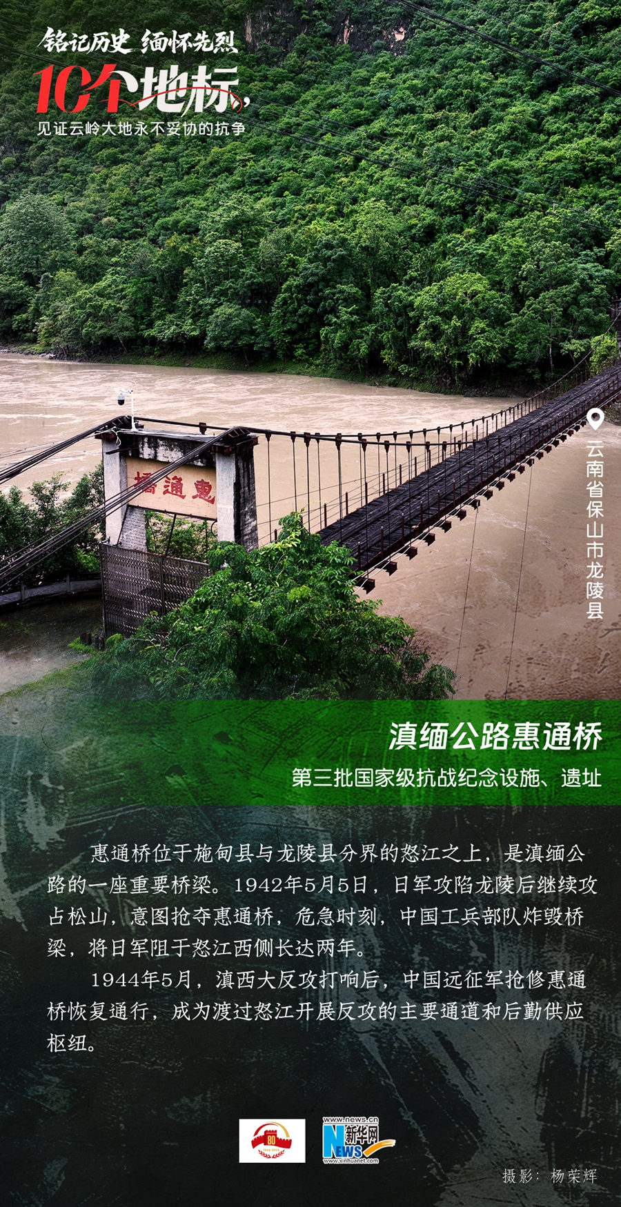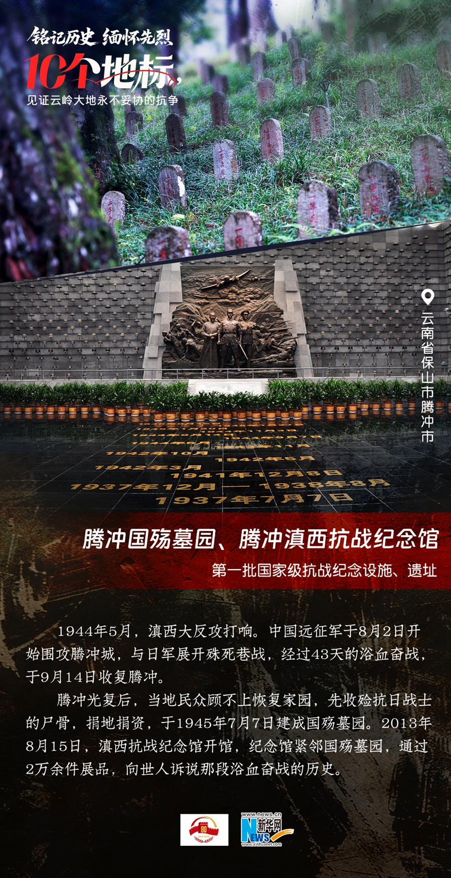 ??80年過去,曾經(jīng)的戰(zhàn)場硝煙雖散,但英氣永存。在國務(wù)院公布的前三批國家級抗戰(zhàn)紀(jì)念設(shè)施、遺址名錄中,云南省共有10個,分別為騰沖國殤墓園、騰沖滇西抗戰(zhàn)紀(jì)念館,龍陵抗日戰(zhàn)爭紀(jì)念館,國立西南聯(lián)合大學(xué)舊址,抗戰(zhàn)勝利紀(jì)念堂,松山戰(zhàn)役舊址,南洋華僑機(jī)工回國抗日紀(jì)念碑,怒江駝峰航線紀(jì)念館,施甸縣抗日江防遺跡群,滇緬公路惠通橋,滇西抗日戰(zhàn)爭紀(jì)念碑。它們承載著國人共同的歷史記憶與民族情感,也為我們學(xué)習(xí)和傳承抗戰(zhàn)精神提供了現(xiàn)實(shí)條件。