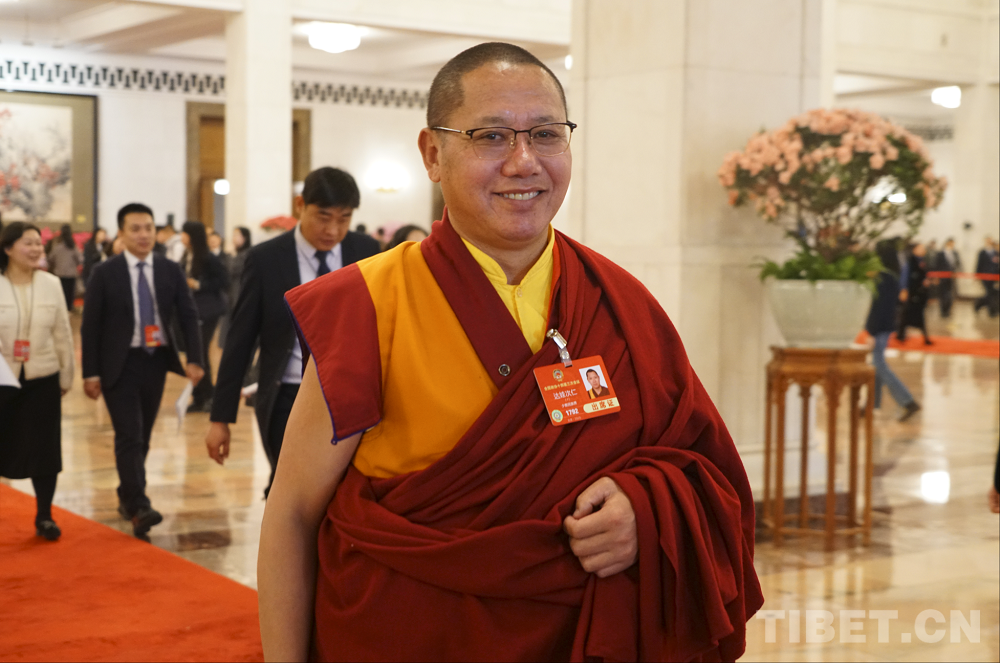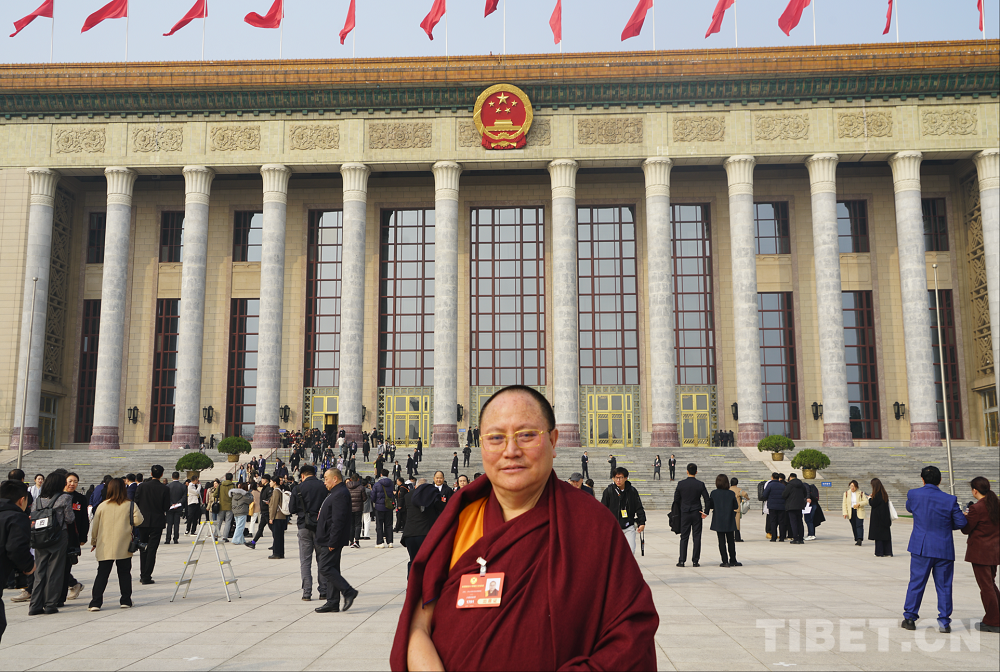 圖為全國政協(xié)委員達扎·尕讓托布旦拉西降措在人民大會堂前 攝影:楊眉笑
