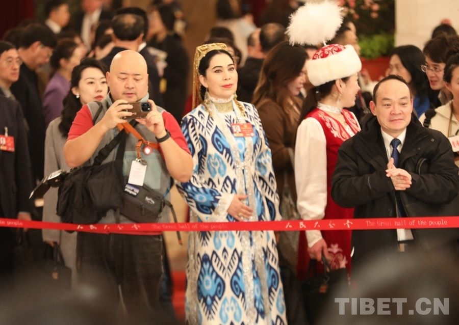 3月5日上午,首場“代表通道”集中采訪活動在人民大會堂舉行。全國人大代表、新疆維吾爾自治區(qū)少數民族古籍保護研究中心副編審米娜瓦爾·艾比布拉(前排左二)旁聽代表發(fā)言。