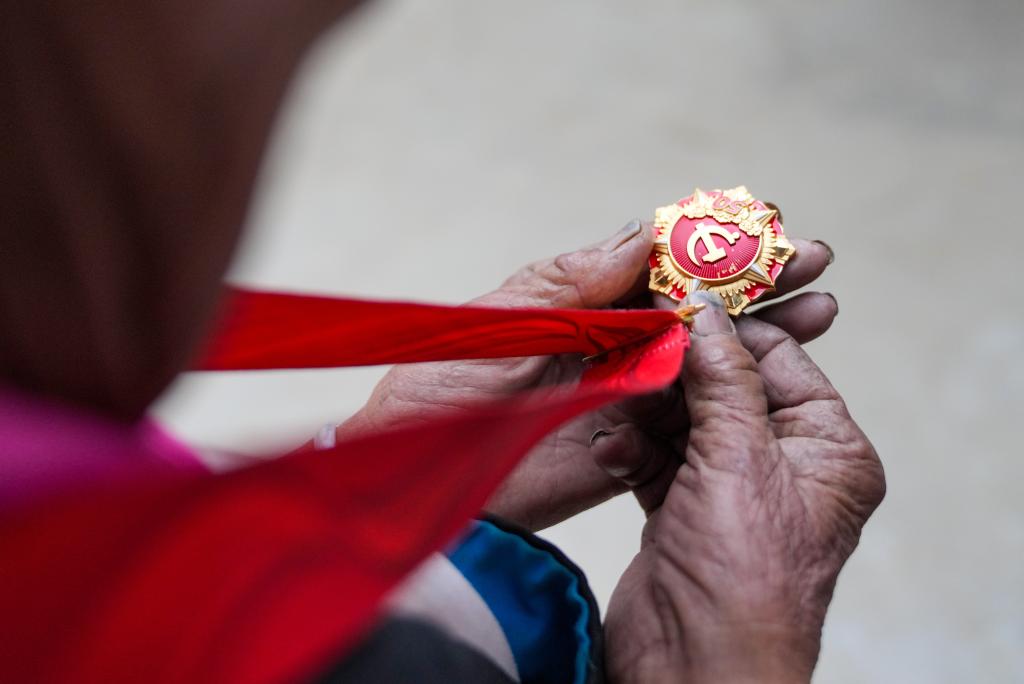普珍佩戴上“光榮在黨50年”紀(jì)念章(3月12日攝)。